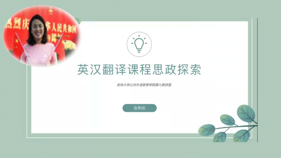 首先,大学英语第七教研室张荆欣老师以英汉翻译课程思政探索为主题,从多个角度回顾了课程思政的产生背景,并强调了课程思政建设的重要性。其次,张老师根据《大学英语教学指南(2020版)》及教育部印发的《高等学校课程思政建设指导纲要》等指导文件,从英汉翻译的课程特点及学生基本学情入手,分享了英汉翻译课程思政的教学目标、思政元素的挖掘以及思政素材如何与课程知识点相结合的话。“习近平新时代中国特色社会主义思想、历史唯物主义、辩证唯物主义科学思维方法、党的十九届五中全会精神、十四五规划及2035年远景目标、外语学科中的人文教育、跨文化素养、批判性思维、中西文化对比以及翻译学科在中西文化交流中的独特作用等方面内容分都是外语课程思政“溶盐入水”过程中重要的“盐分”来源。此外,张荆欣老师还结合具体教学方法分享了英汉翻译课程思政教学设计方案,同时强调了具体实施外语课程思政过程中需要注意的问题及其产生原因。