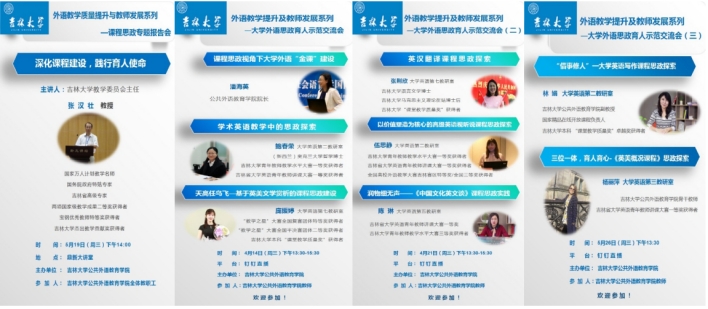 近年来,学院全面推进大学外语课程思政建设工作,不断健全学院课程思政建设体系,结合学校实际不断丰富大学外语课程思政建设的吉大内涵。学院积极组织教师参加课程思政教学能力相关培训,邀请专家为全院教师做课程思政专题报告会;组织教师参加“讲述课程思政的故事”征文活动、积极申报课程思政“学科育人示范课程”项目等。学院按各课程团队就课程思政进行深入交流,多次组织大学外语思政育人示范交流会。通过多种方式,学院努力实现外语课程建设与思政教育的有机融合,全面提升教学质量和育人效果。