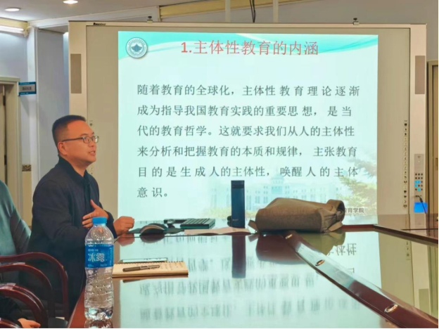 随后,王栋老师主要从主体性教育的内涵、大学英语课堂主体性意识培养的尝试与主体性教育到底要培养什么样的人三个角度进行探讨,再次重申了主体性教育的内涵,并在自主学习意识的培养、独立思考意识的培养和自我管理意识的培养三个方面通过文字与视频进行示例与详细解析。