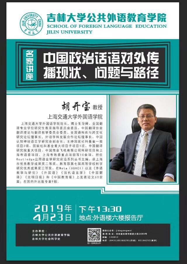 报告题目:中国政治话语对外传播:现状、问题与路径报 告 人:胡开宝 教授 上海交通大学外国语学院 院长讲座时间:2019年4月23日下午13:30讲座地点:中心校区外语楼六楼报告厅主办单位:宝威体育在线注册 吉林大学社会科学处