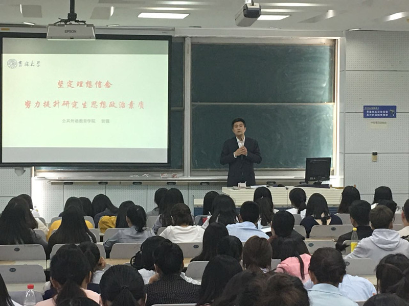 6月5日晚,公共外语教育学院于逸夫楼一阶召开了“坚定理想信念,努力提升研究生思想政治素质”专题党课教育活动。本次党课由学院贺强书记主讲,教科研办公室主任李欣霜老师、学院全体在籍研究生参加。