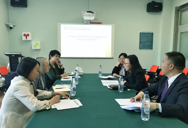9月1日上午美国肯塔基大学助理教务长苏•罗伯茨女士、孔子学院院长修华静女士来访公共外语教育学院,与公共外语教育学院的代表进行了会谈。会谈由院长潘海英教授主持,原院长战菊教授、副院长杜中全副教授、国际处综合科科长白茵参加了会谈。