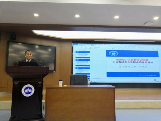 为深入贯彻落实习近平总书记对研究生教育工作的重要指示和全国研究生教育工作大会会议精神,学习习近平总书记回信勉励全国高校黄大年式教师团队代表的有关精神,深化研究生培养质量,进一步提高研究生导师队伍与素质,公共外语教育学院协同研究生院于2021年12月15日,邀请东北师范大学外国语学院博士研究生导师张绍杰教授做题为“教师学习者和教师研究者:外语教师专业发展中的身份建构”的学术报告。学术报告由副院长姜峰教授主持,院长潘海英教授、研究生导师及博士、硕士研究生参会。